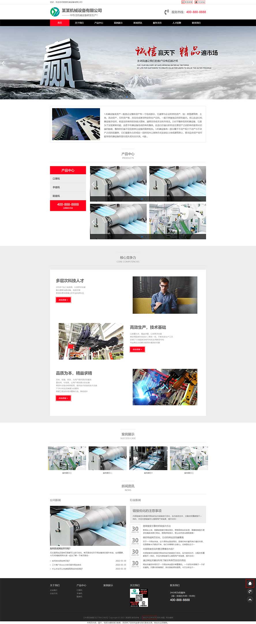這套響應(yīng)式醫(yī)療設(shè)備防護(hù)口罩生產(chǎn)加工設(shè)備網(wǎng)站源碼,默認(rèn)開設(shè)網(wǎng)站首頁、關(guān)于我們、產(chǎn)品中心、案例展示、新聞資訊、服務(wù)支持、人才招聘、聯(lián)系我們等7個欄目,支持增刪改欄目名。網(wǎng)站頂部是網(wǎng)站名和導(dǎo)航條以及400服務(wù)熱線,支持二級下拉子菜單和背景高亮效果,然后是2張自動切換通欄焦點(diǎn)大圖。